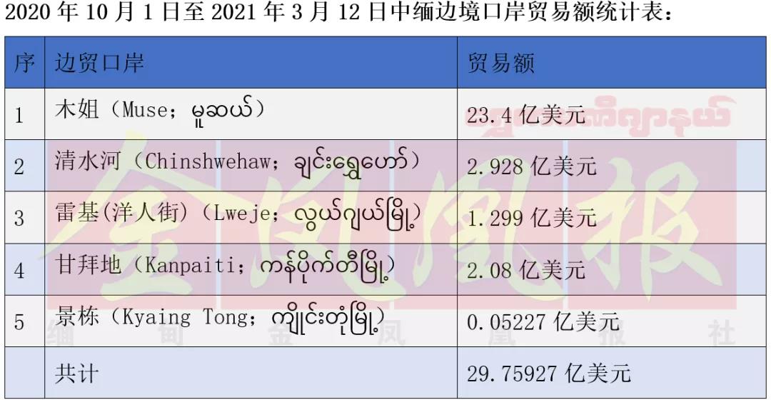 其中在缅中贸易方面,缅甸向中国出口总额为20.5亿美元,进口额为9.2049亿美元,这表明缅中5个半月来的边贸总额达到29.7亿美元。而上一财年同期中缅边贸总额为27.5亿多美元,这表明缅中边贸总额与去年同期相比增加了2.1885亿美元。