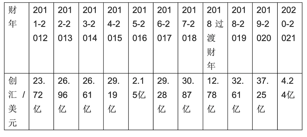 各财年农产品出口收入如下: