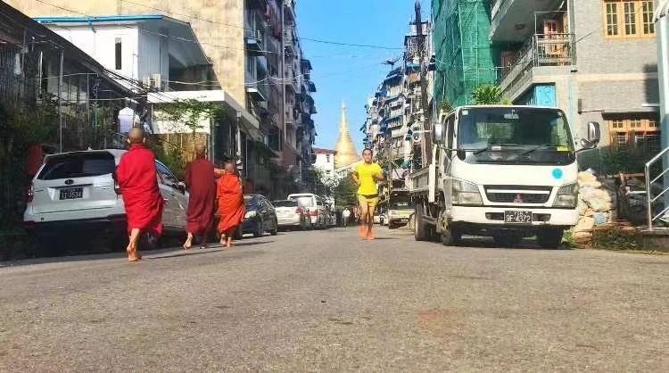 当然除了环绕皇家湖,你也可以选择穿越温德姆至尊酒店附近的道路,你会在道路的视线尽头看见城市的最高点——金碧生辉的仰光大金塔——那里到酒店只有1.5公里;你会看见道路旁边时光斑驳而神秘的雕砌栏杆,记载着厚重的文化印记;也许你也会同我一样,在途中与身着僧袍的小沙弥们因缘际会。