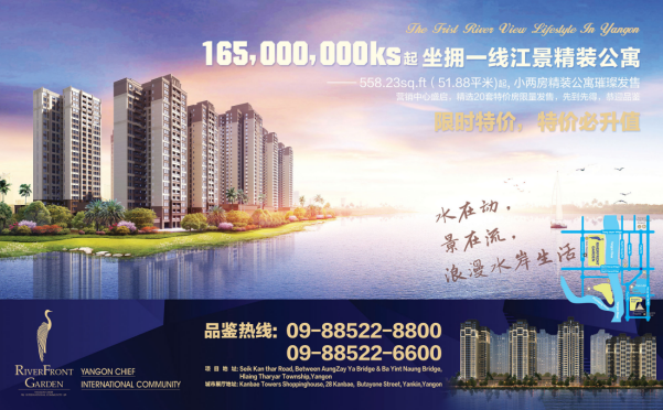 River Front Garden---仰光临水而建的国际标准生活社区,雄踞Hlaing Thar Yar核心区,位于Aung Zay Ya Bridge和Bayint Naung Bridge两座大桥之间。距离仰光市中心及仰光国际机场20分钟车程,多维交通网络覆盖。一期占地10英亩,11栋建筑规划错落有致,屹立于仰光母亲河——Hlaing River江畔。