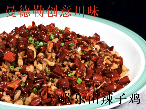 曼德勒海鲜酒楼推出的王牌菜品:歌乐山辣子鸡。这款辣子鸡的成菜色泽棕红油亮,麻辣鲜香,越吃越想吃。端上桌的辣子鸡干香厚重,鸡肉与辣椒入味融合,咬开过后是香脆可口,刺激着你的味蕾。