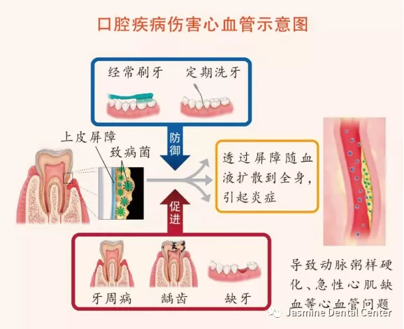 更重要的是,牙周病还可能导致心血管疾病、糖尿病、呼吸道疾病、老年痴呆等严重威胁生命的系统性疾病。如果口腔内或牙周有了致病菌,就可能穿透牙周组织的上皮屏障,导致各种毒力因子通过血液扩散到全身,直接感染血管内皮细胞,引起炎症、斑块不稳定以及急性心肌缺血。