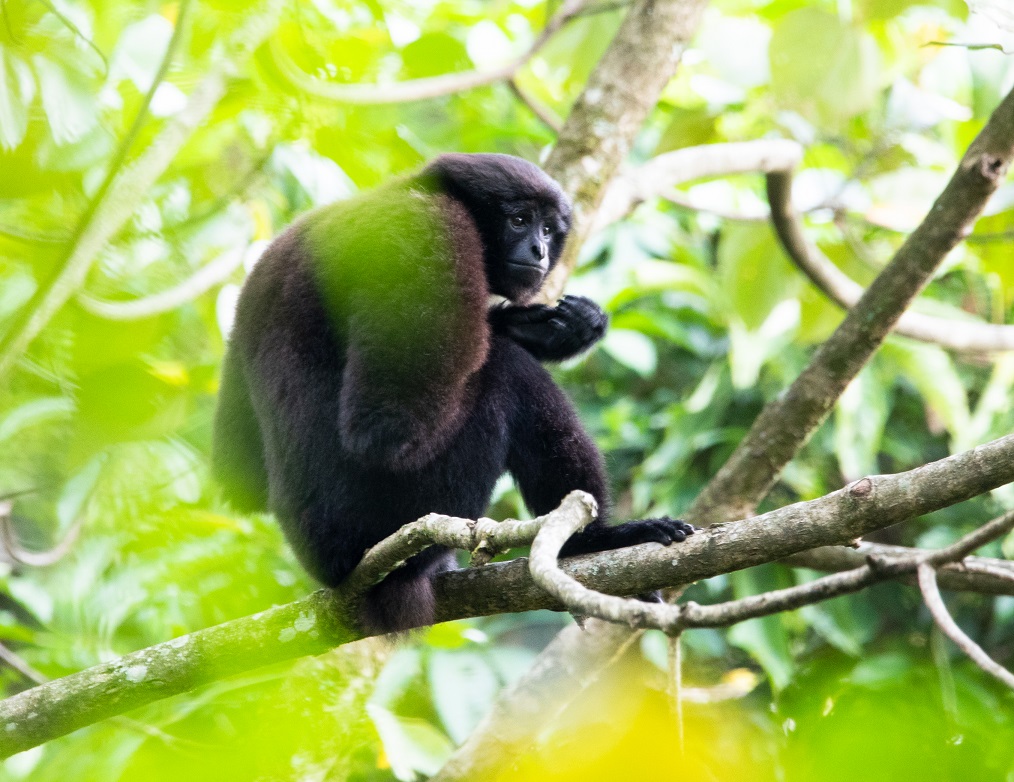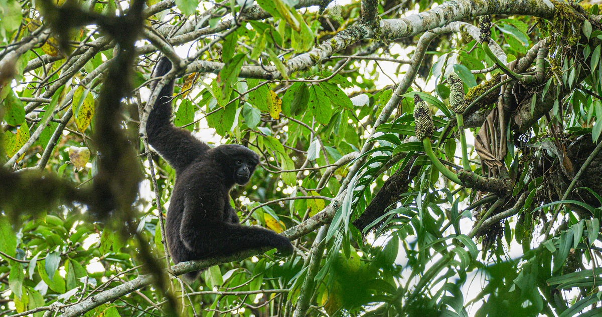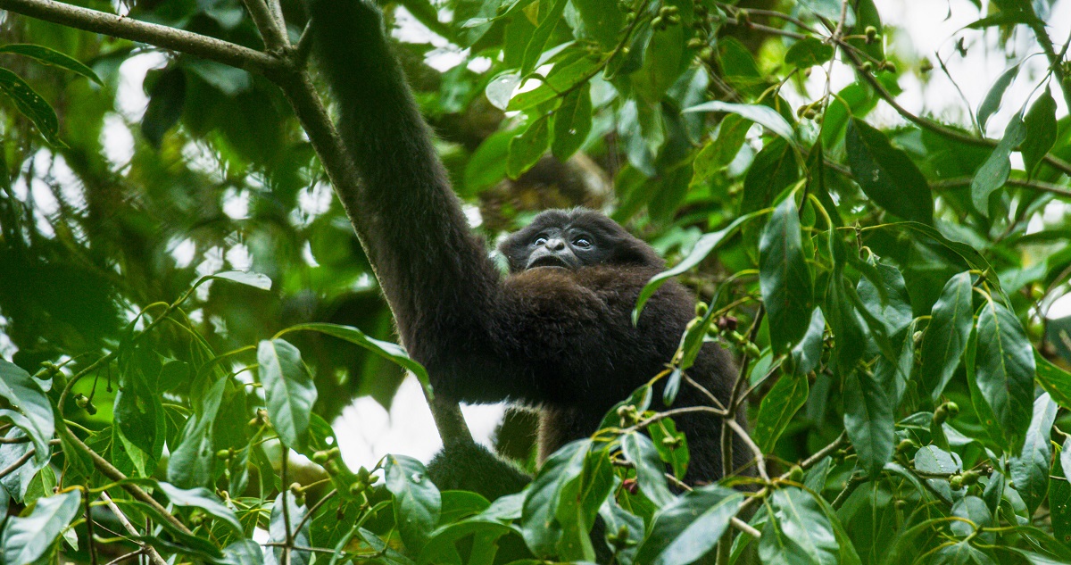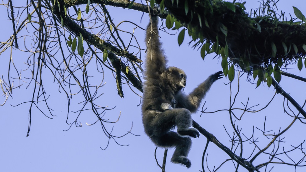 “老鼠不抬头,猿猴不落地。”密林中带路的护林员余忠福告诉记者,天行长臂猿只在树上走,很少下地来,听到响动,就吓跑了。正说话间,突然森林中出现一道黑影,在半空中的树上荡着秋千,身手矫健如履平地。长长的手,白色的眉毛,头顶的毛较长而披向后方。“天行长臂猿没有尾巴、有自我意识且能站立行走的类人猿,也是和人类亲缘关系较近的非人灵长类动物。”云南铜壁关省级自然保护区管护局盈江管护分局副局长左常盛说。