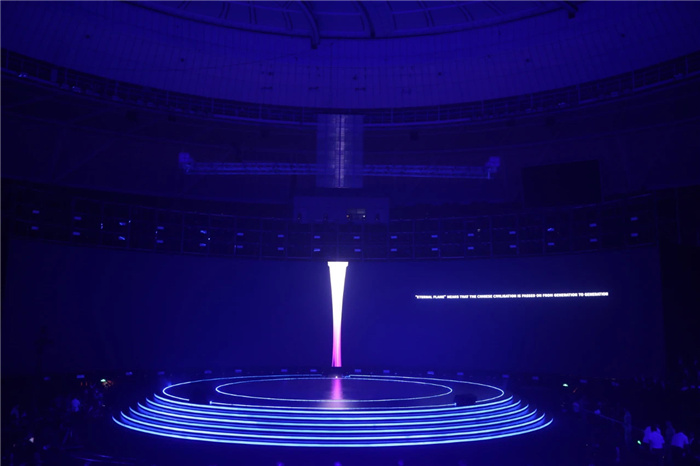 整场活动以“盼”为主题,表达了对于杭州亚运会的热切期盼。现场大屏呈现出时空交错的视觉特效,袁家军走上主舞台发布并展示杭州亚运会火炬形象。名为“薪火”的火炬从玉琮道具中缓缓升起。万众瞩目之下,杭州亚运会火炬喻意着中华文明薪火相传,表达了各国运动员的团结共融,展示了浙江智造的魅力。