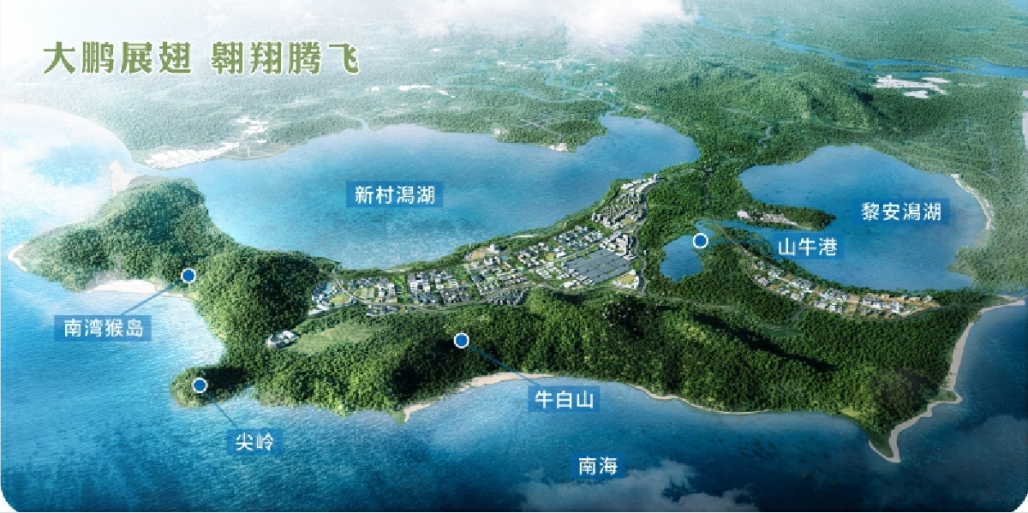 试验区位于陵水东南部,规划范围12.72平方公里,记者在试验区规划现场看到,整个园区有“三山两水一绿心”的生态格局,“三山”分别为猴岛、牛白山和远处的尖岭,“两水”为新村冩湖和黎安冩湖,“一绿心”就是山牛港,就像一只面朝南海振翅欲飞的大鹏鸟。该园区于2020年9月开工建设,是海南自由贸易港建设的11个重点园区之一。项目总投资约50.77亿元,园区向绿色生态方向发展,所有公共建筑实施三星绿色建筑标准,强调“风、光、热、水”的循环利用。