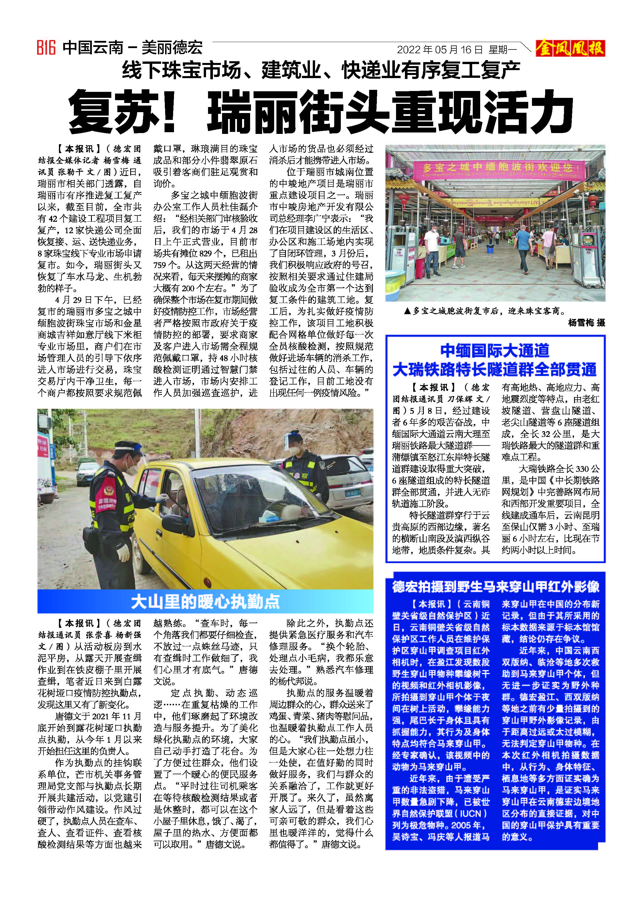 【本报讯】(德宏团结报全媒体记者杨雪梅通讯员张勒干文/图)近日,瑞丽市相关部门透露,自瑞丽市有序推进复工复产以来,截至目前,全市共有42个建设工程项目复工复产,12家快递公司全面恢复接、运、送快递业务,8家珠宝线下专业市场申请复市。如今,瑞丽街头又恢复了车水马龙、生机勃勃的样子。