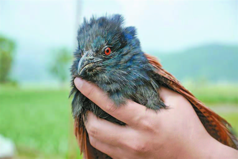 这只鸟双翅呈褐黄色,还拖着长长的尾巴。在场民兵都觉得这只鸟很罕见,说不定是国家保护动物,于是立刻上网查阅,才知道该鸟为国家二级保护动物褐翅鸦鹃。