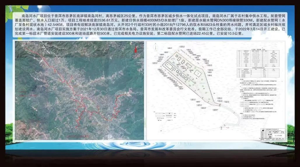 南岛河水厂属于农村集中供水工程,项目新建日供水规模4000方的水处理厂1座、新建42.54千米配水管网等设施设备。项目于2022年3月14日开工建设,项目完工后将有效解决南屏镇南岛河、大开河2个行政村33村民小组2018户12796人的饮水和5823头牲畜的用水问题,并可满足区域乡村振兴规划建设用水。除南岛河水厂之外,普洱市拟在思茅港、云仙、龙潭等乡镇新建4个集中供水水厂,预计年内可全部开工。思茅区5个集中供水水厂的建成,将有效解决思茅区10228户58326人农村集中供水和30285头牲畜用水,为乡村振兴建设发展、生产生活用水奠定了基础。