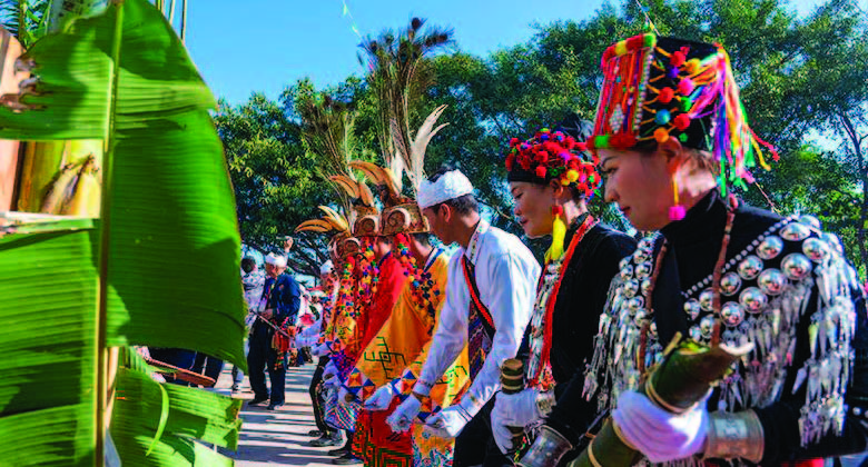 蜿蜒绵长的舞队中,持握长刀的景颇儿郎,跟随节奏踱步而舞、热情奔放,笑容灿烂的景颇姑娘踩着鼓点摆动彩扇,身上缀满的银泡跳得唰唰作响,参与盛会的各族同胞被热烈浓郁的民族风情所感染,主动加入舞队,与景颇族同胞一起纵情欢跳。