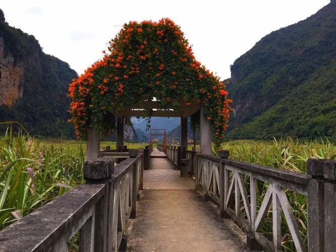 长廊两面的峭壁高80米至320米,青峰叠翠间,还镶嵌有连片的侏罗纪时期植物群林——董棕林,状似芭蕉扇,微风吹过,叶片抖动,沙沙作响。若是春天来这,可见长廊下油菜花迎风招展,片片金黄为碧绿的谷间添一抹灵动的色彩,漫步长廊之上,宛如置身于花海间。长廊间整个构图因酷似一幅浓墨重彩的中国山水国画,因此被称为“国画长廊”。