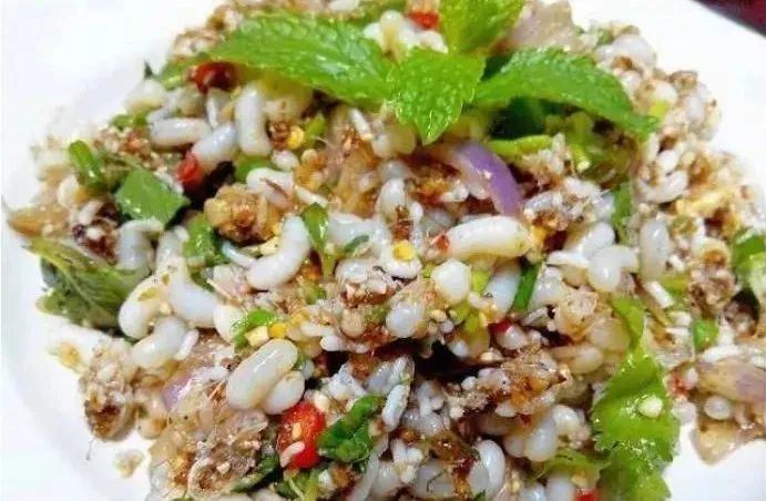 知了肉圆子。知了即蝉,用蝉做圆子,也是具有傣族风味的一道美食。将知了去除双翅和腹部,与鸡肉一起剁细,拌上糯米粉,以番茄汁做汤。待番茄汤烧开,将知了糊捏成肉圆子下锅,煮熟后盛人碗中,撒上芫荽、小葱、细盐等佐料,即可食用。鲜美可口,风味独特。