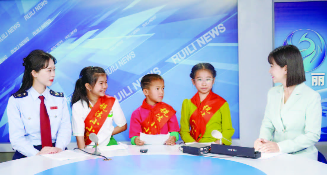 缅甸学生南胜妞(左二)作为“税法小小宣传员”代表,受中国税务部门邀请,与另外两名同学一起,来到了中国云南省瑞丽市融媒体中心,接受中国记者的采访,以小学生的视角讲税收,开展了别有趣味的税收宣传。