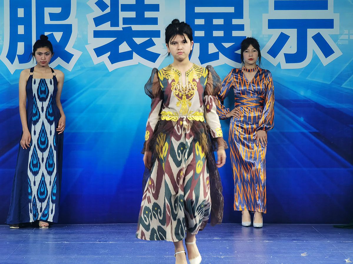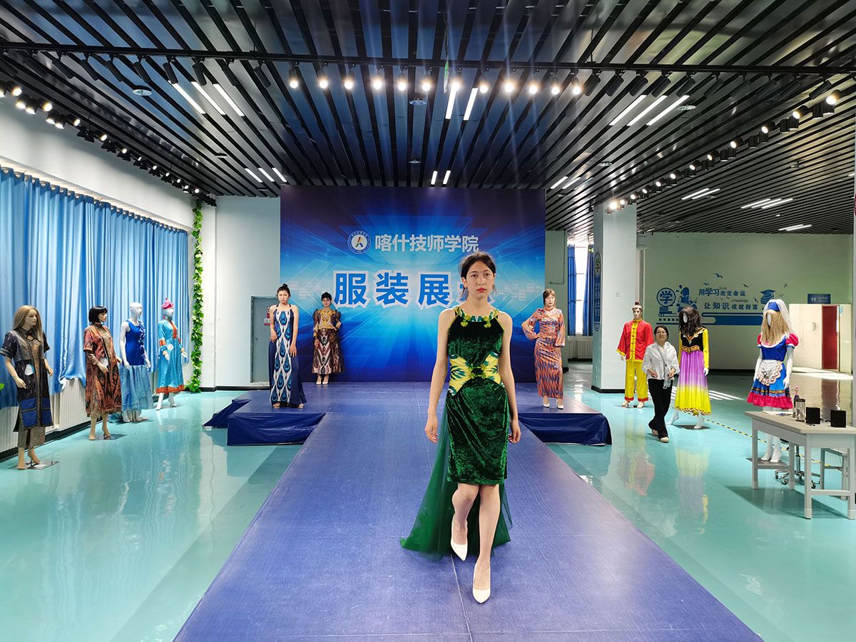 在喀什技师学院中,一块块花纹独特的“艾德莱斯”正在新一批学生们的手中变成一款款兼具传统韵味与现代时尚的服装。缝纫台不远处的T台上,学生们正身着自己设计的服饰,联系走秀步伐,为即将到来的全国技能大赛做最后的冲刺练习。这些学生均来自喀什技师学院服装设计专业。