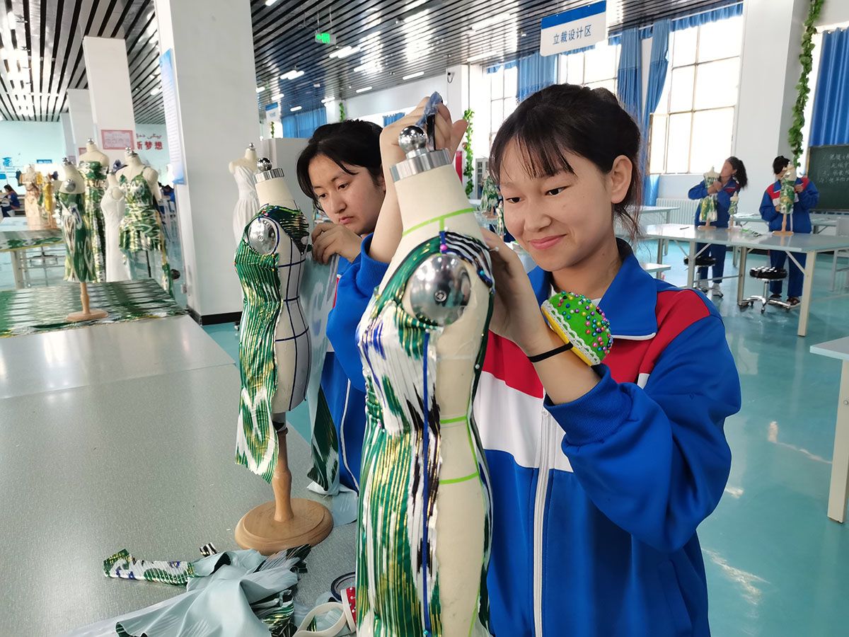 在服装设计教室中,学生正在老师的指导下,或挥动手中的画笔,将自己脑海中的灵感映于纸上,或舞动银针,将每一块“艾德莱斯”绸从灵感变为独一无二的服饰,也将自己对未来的美好畅想注入其中。