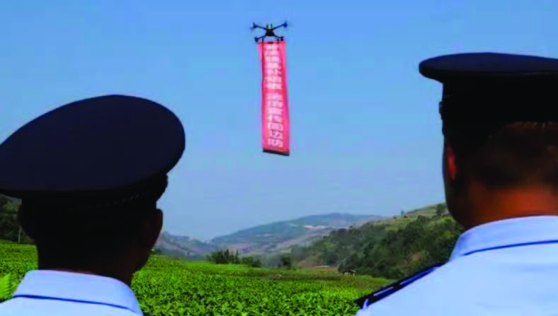 德宏边境管理支队中山边境派出所民警利用警用无人机在空中盘旋喊话宣传。云南法治网
