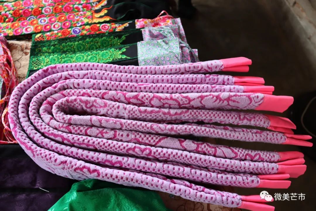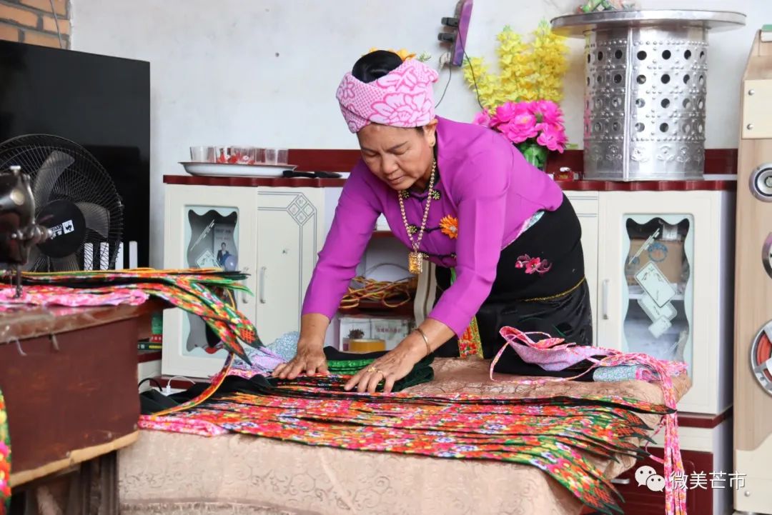 家住在风平镇芒赛村委会拉院小组的朝咩旺宝绣的花腰带在芒市较有名气。