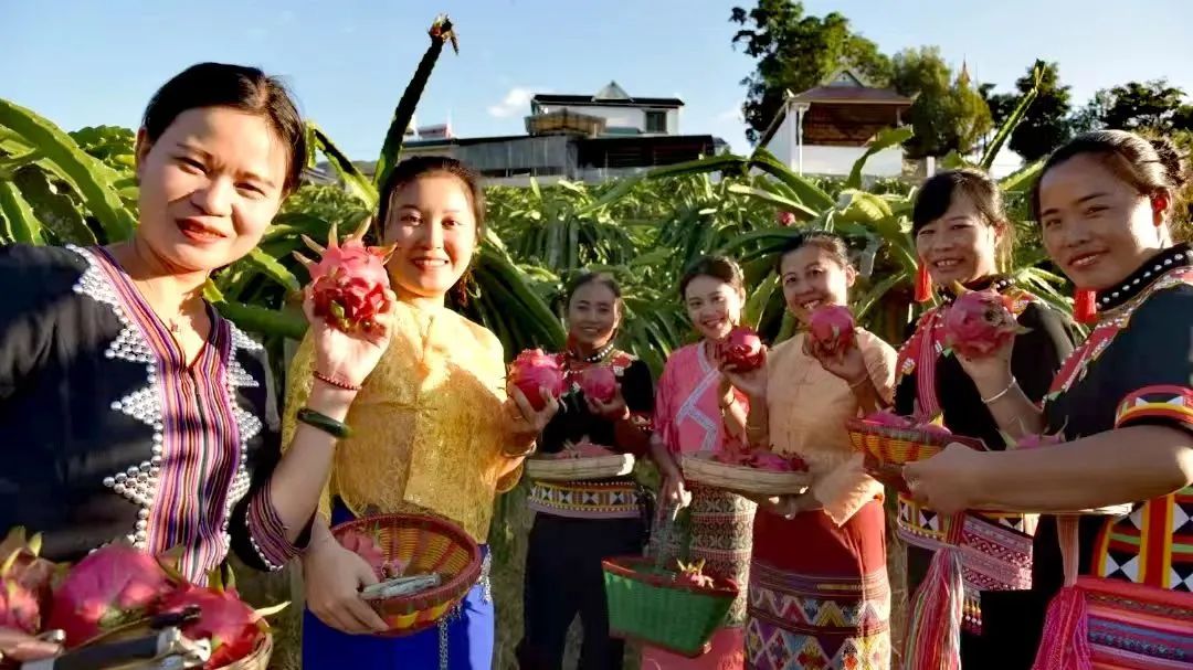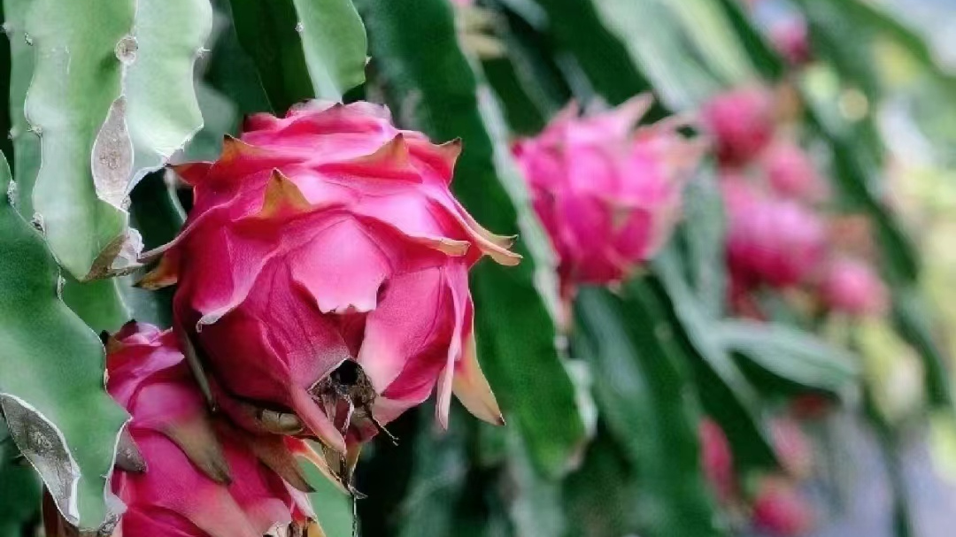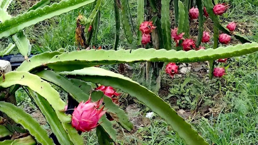 又到火龙果成熟的季节,在双江拉祜族佤族布朗族傣族自治县勐勐镇大荒田村的千亩火龙果种植园里,整齐的支架上,翠绿枝叶郁郁葱葱,一个个红彤彤、硕大饱满的火龙果挂满枝头,绿叶映衬着红果,美不胜收。果农们穿梭在果园里忙着采摘,今年又是一个火龙果丰收年。