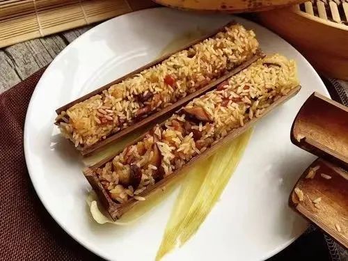 以竹为釜的风俗,傣族及景颇族中至今都还存在。选一根嫩竹子,锯成数截,一端开口,然后把红米、腊肉、花生、草果等拌好放进去,加水塞住开口,放到火上烧,等到竹子焦黄欲裂时,里面的饭食也熟透了。竹筒饭,妙就妙在融进了竹子特有的香味,吃起来满口清香。