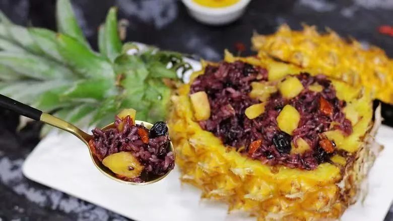 耿马傣族的特色糯制食品。制作时,先将紫糯米淘洗干净,浸泡七八个小时,然后与剁细的猪肉拌匀,用刀在菠萝顶端开个盖,掏去菠萝心,放入紫糯米,再把切去的盖盖上,放到甑锅里蒸熟。其味香甜可口,且有补血润肺之功效。