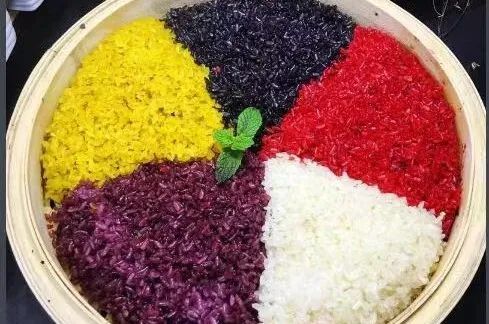 五色花米饭是傣族人的特色食品,不但色彩鲜艳,而且味道很好,有红、紫、黑、白、黄五种颜色。每年的秋后,傣族人把上等的糯米挑选出来,单独放好留待做花米饭用。傣家五色花米饭不但色鲜味美,而且还有较好的药用价值。