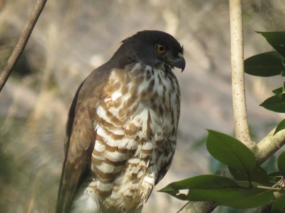 学名:Accipiter trivirgatus为鹰形目鹰科鹰属鸟类,体长41—49厘米,中型猛禽,领域性强,属留鸟,一年四季可见。通常栖息在2000米以下的山地森林和山脚林缘地带,也出现在竹林和小面积丛林地带,偶尔也到山脚平原和村庄附近活动。凤头鹰性善隐藏而机警,常躲藏在树叶丛中,有时也栖于空旷处孤立的树枝上,是森林中的“顶级猎手”。
