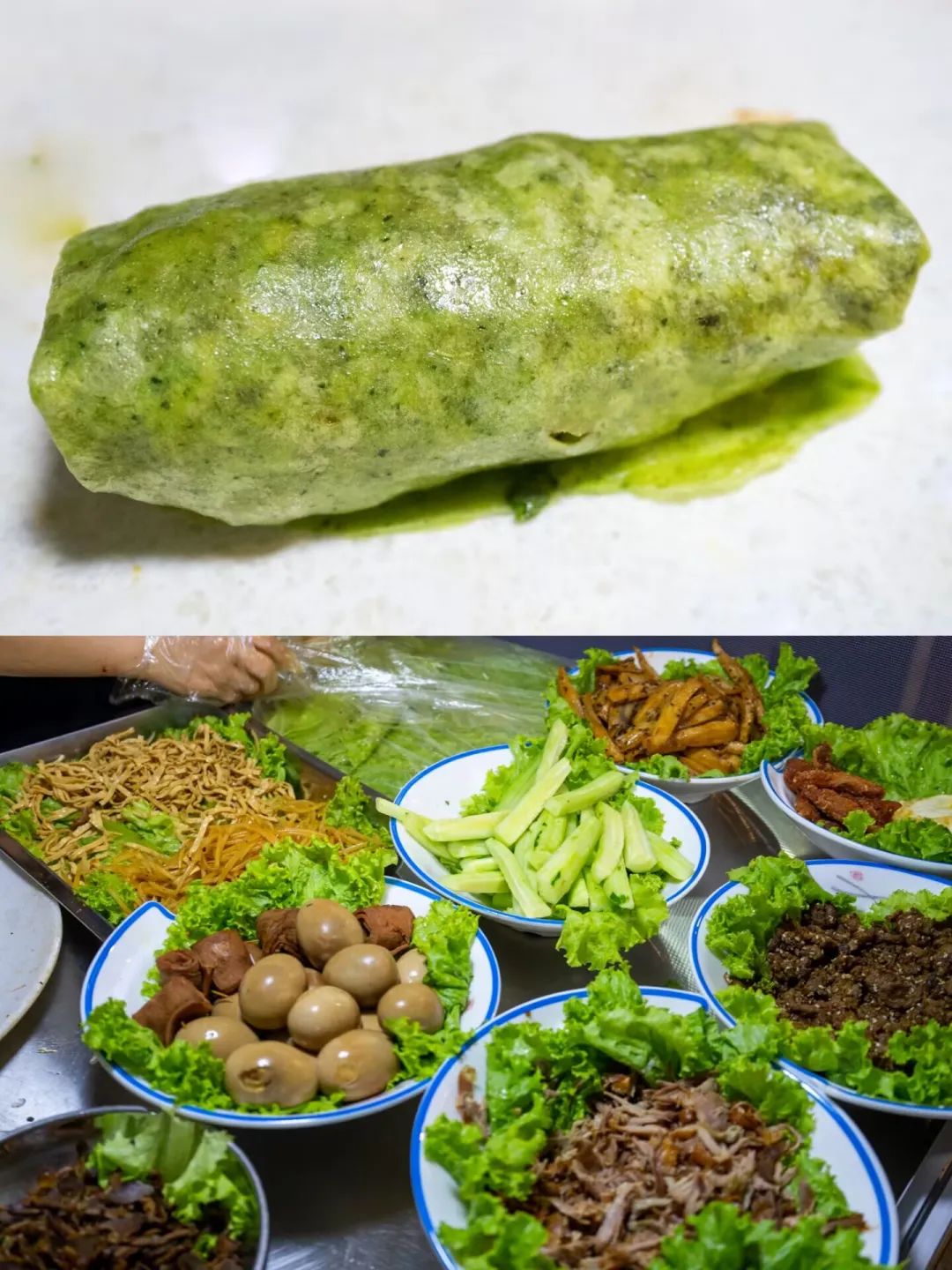 卤肉卷独具特色,加入了蔬菜制成的面饼刷上辣酱,包裹上特制的卤肉、火腿、鸡柳和蔬菜一口下去,幸福感爆棚!
