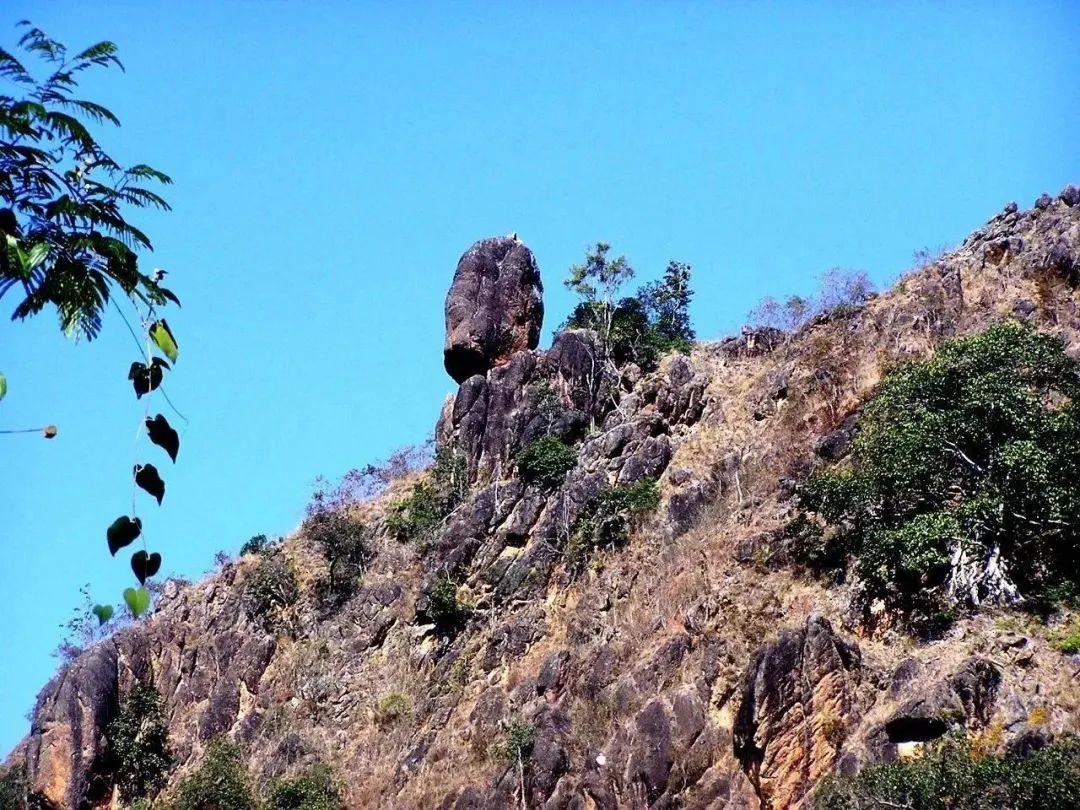 从南面看犹如一位威武的将军守望着富庶的勐勐坝。从北面看它又犹如一位哀伤的恋人低头沉吟。传说那是一对被拆散的恋人,女的跳入河中成了睡美人,男的忧伤过度变成了望江石郎。两人在绵绵遗恨中永远互相凝望.....