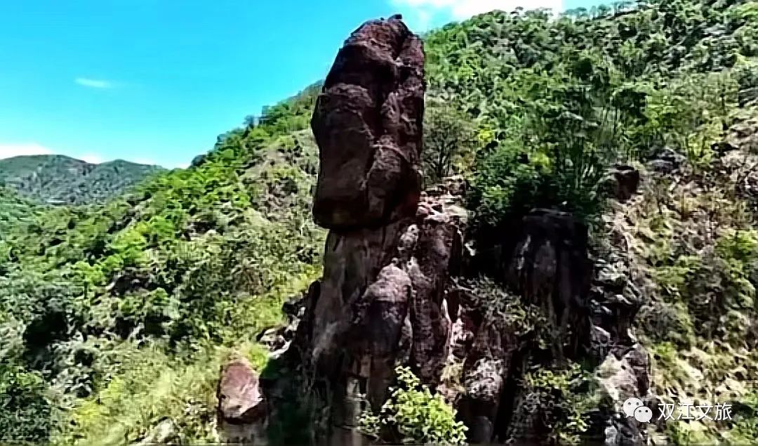 “望江石郎”位于双江县城南部10公里处的小黑江上游河畔。因景区内有一奇石而冠名,又称“望夫石”、“将军石”,它高踞于悬崖之上,此石高5米,周长约12米,成不规则的卵圆形,小头朝下斜支于另一块山石上,给人以摇摇欲坠之感。