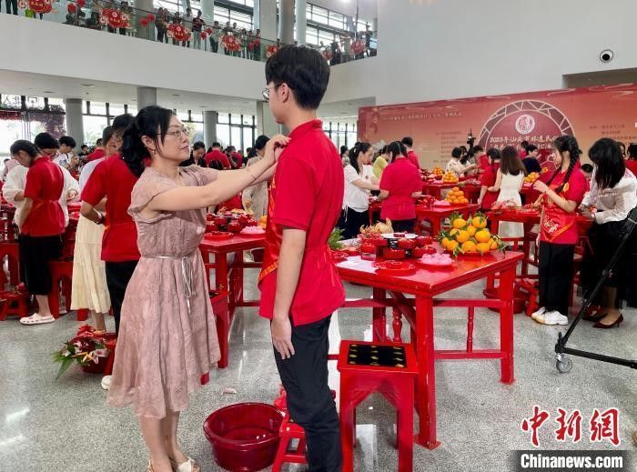 活动现场,在“出花园”市级非遗传承人蔡静燕指导下,孩子们穿上红木屐,依次完成了沐浴更衣礼、感恩礼、跳胶掠、“头彩食”等环节,完成了“出花园”这项传统成人礼俗。