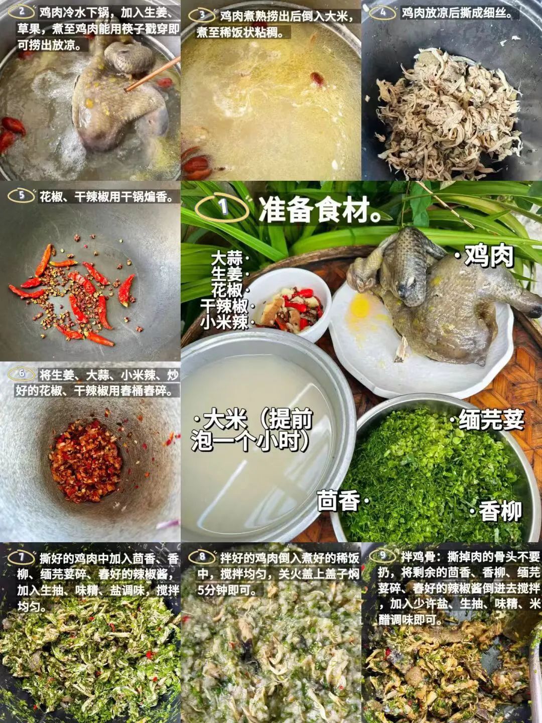 准备食材:鸡、大米(提前泡一个小时四五个人差不多一碗米)、茴香、香柳、缅芫荽(还可以加薄荷、金薄荷)、小米辣、干辣椒、花椒、大蒜、生姜。