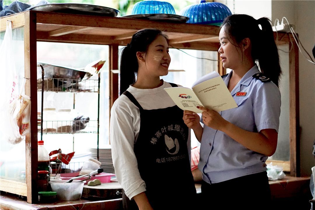 图为税务干部在向售卖撒撇的缅籍店家讲解税收优惠政策。