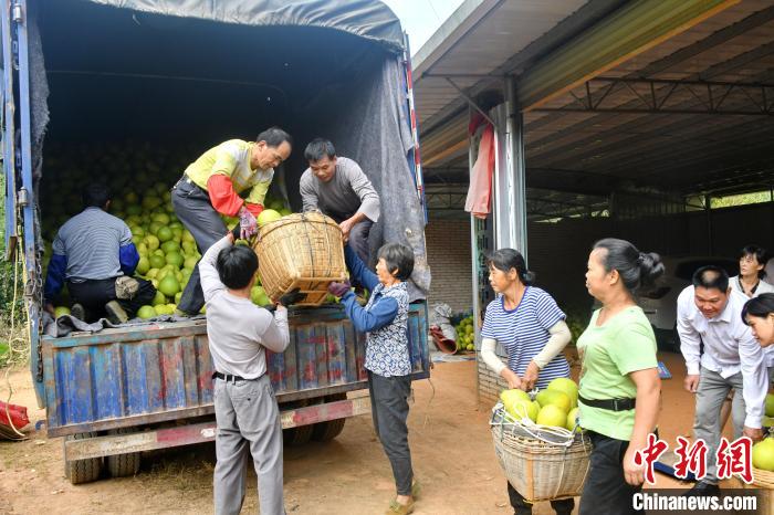 图为果农正在搬运容县沙田柚。韦捷摄