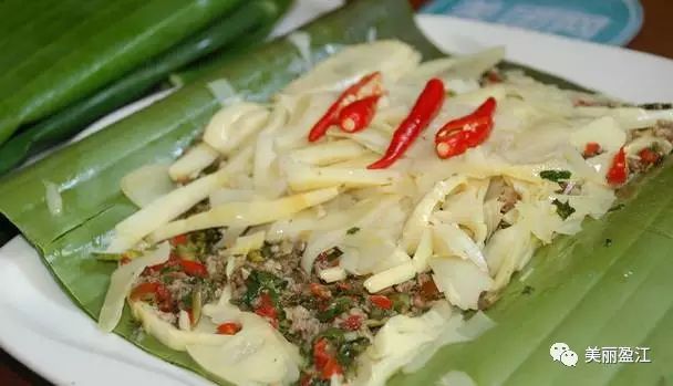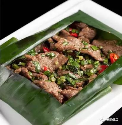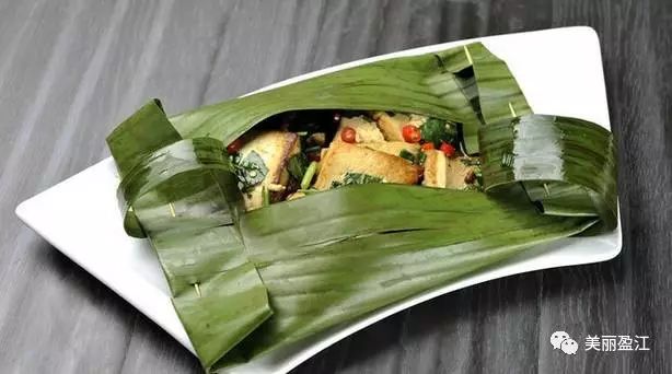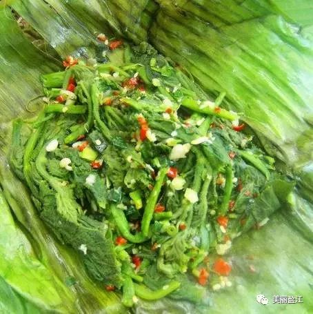 新鲜的瓜果蔬菜加以青椒,鲜姜,蒜瓣,芫荽等配料,用叶子包裹严实,烧制而成后,入味且带有民族风味。