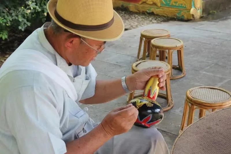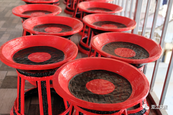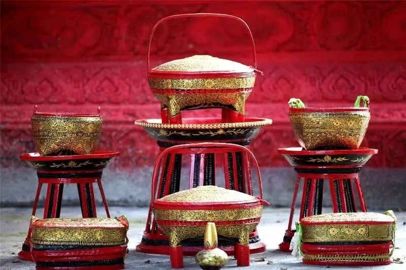 有一位老人在成形的土陶和竹器上画着精美的图案,这便是“胎漆”。以素胚为底,用黑、红色漆做底色,最后用金色勾勒出佛塔、龙凤、谷穗、莲花等象征吉祥的图案。此刻,幸福随笔尖的流动而布满了整个傣家寨子。