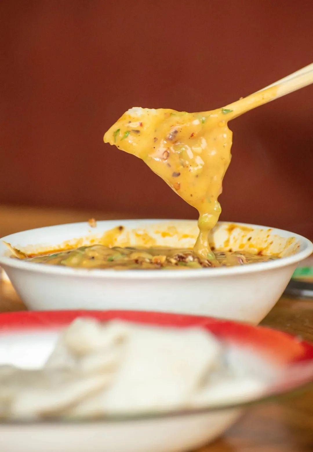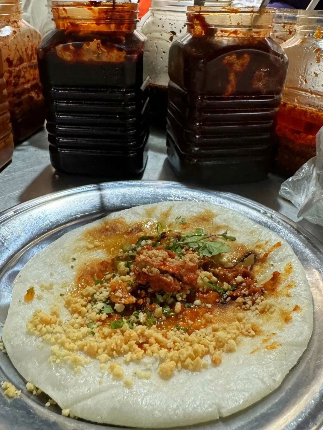放上咸酱、花生等各种佐料