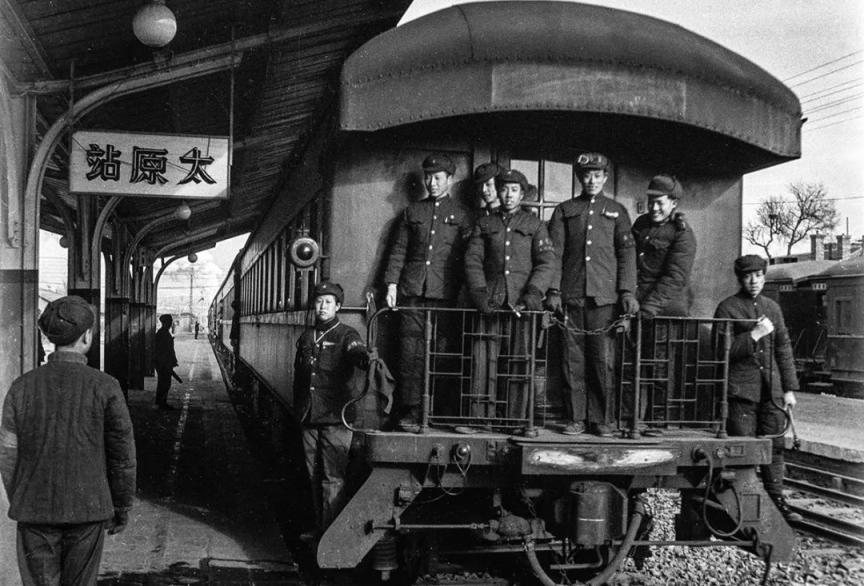 1953年1月,山西太原站。列车出站时,太原站的女运转车车长李宝林(左二)查看车站情形。工人日报记者 赵本甲 摄