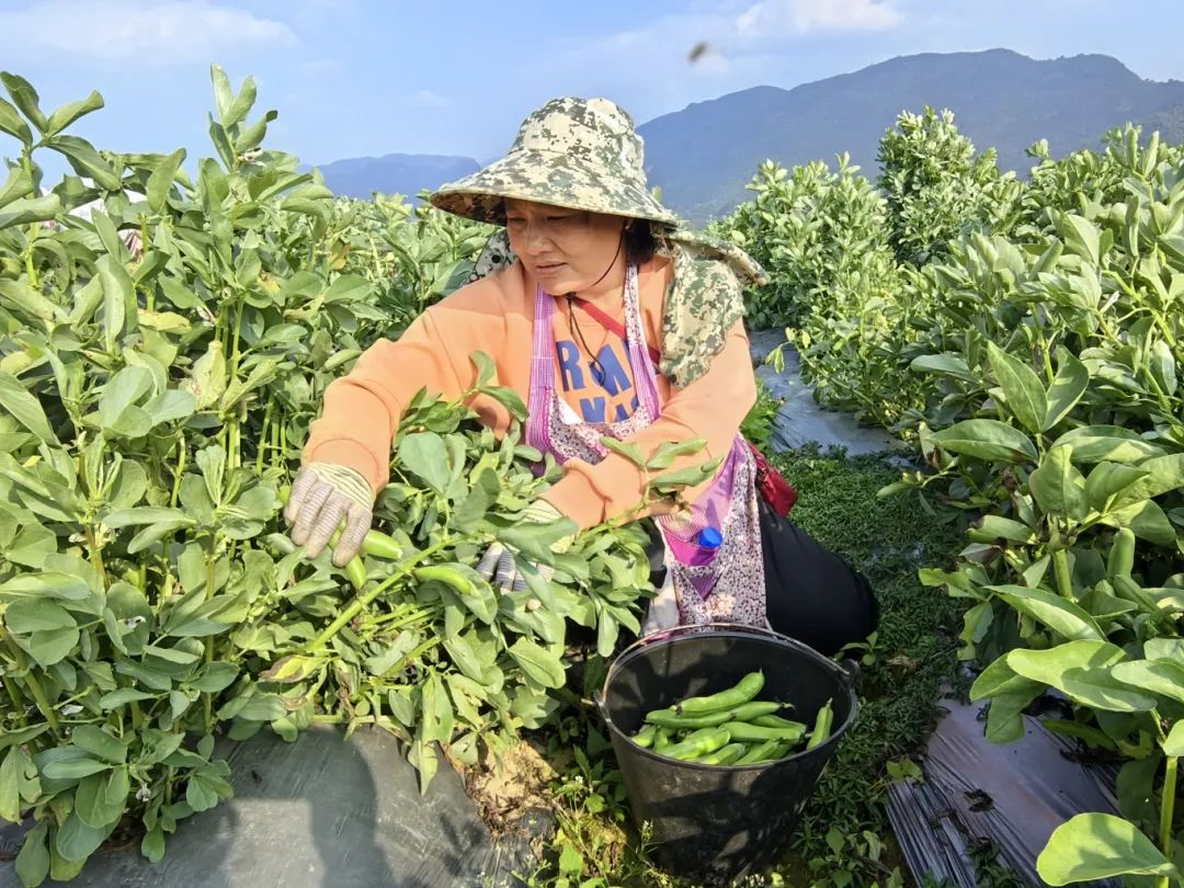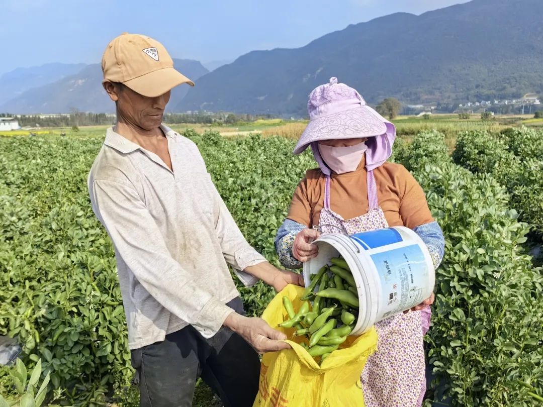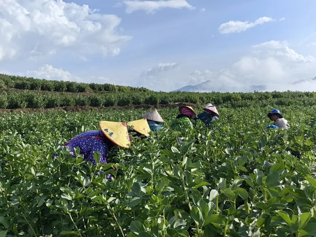 在勐撒镇班必村蒿子坝组蚕豆种植基地,一颗颗果实在阳光下嫩绿青翠,丰润饱满,村民们正娴熟地在蚕豆丛中挑选出成熟的蚕豆,快速摘下,不一会儿,就能摘上满满一桶。