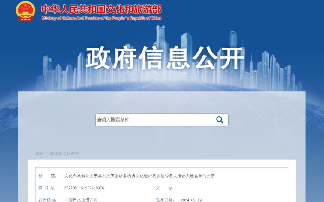 近日,国家文化和旅游部公布《第六批国家级非物质文化遗产代表性传承人推荐人选名单》。