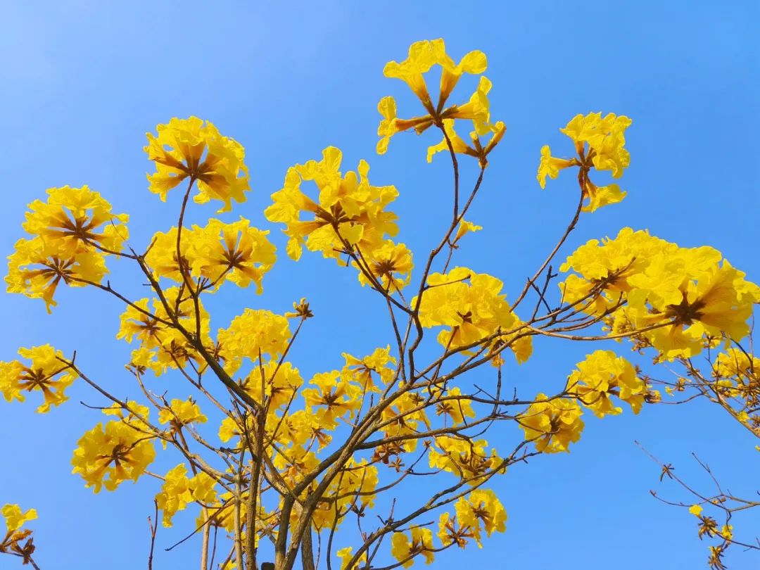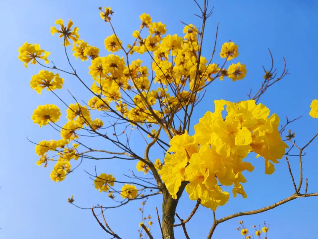 黄花风铃木因花黄色,形如风铃而得名。黄花风铃木的花朵从初露头角逐渐呈成片盛开之势,满树金灿灿的黄花,看起来美不胜收。纷繁的金色叶子被风鼓荡着吹起,好似翩翩起舞的蝴蝶。在微寒的南方初春时节,彰显出勃勃的生机和幸福的寓意。