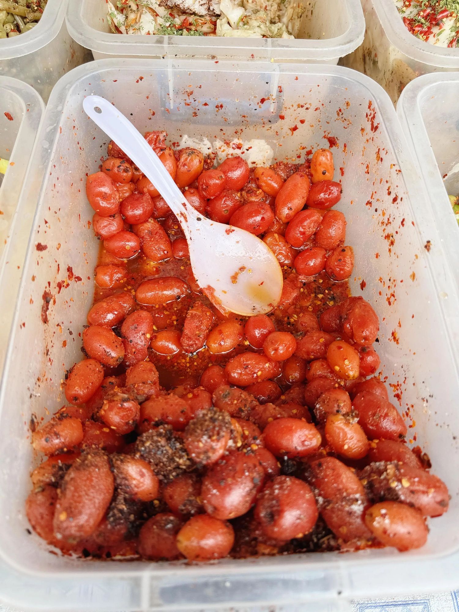 加入盐、糖、胡辣子面拌匀就可食用