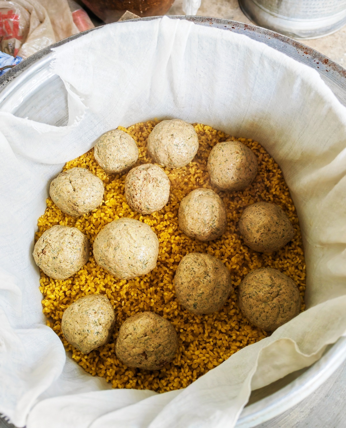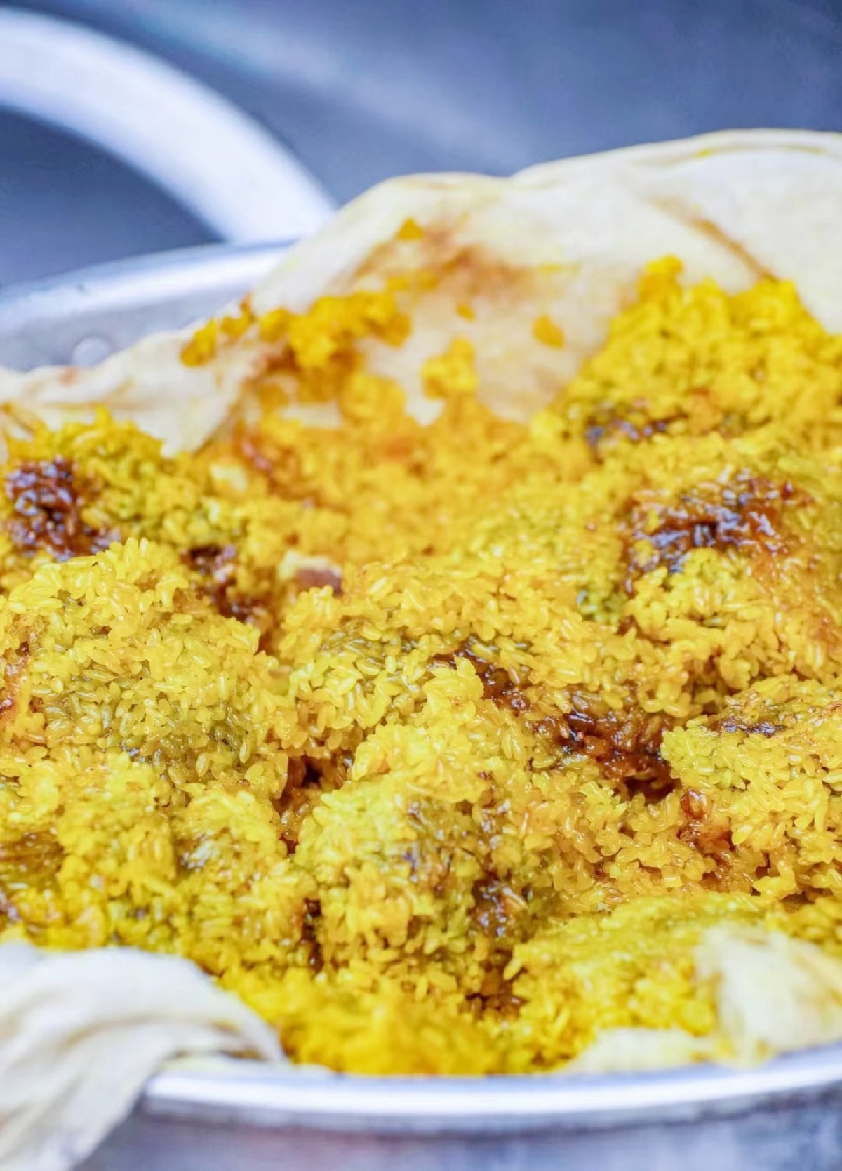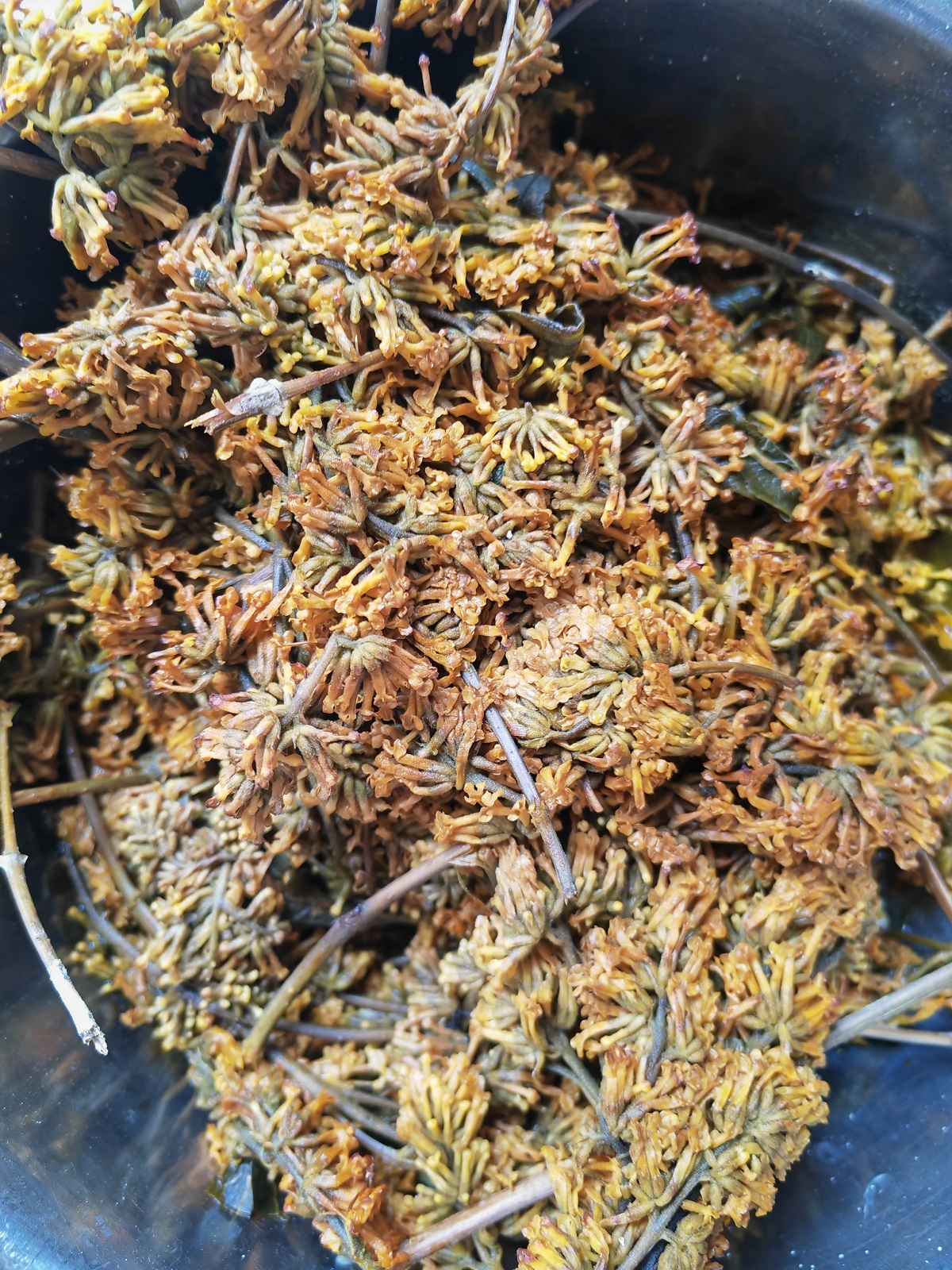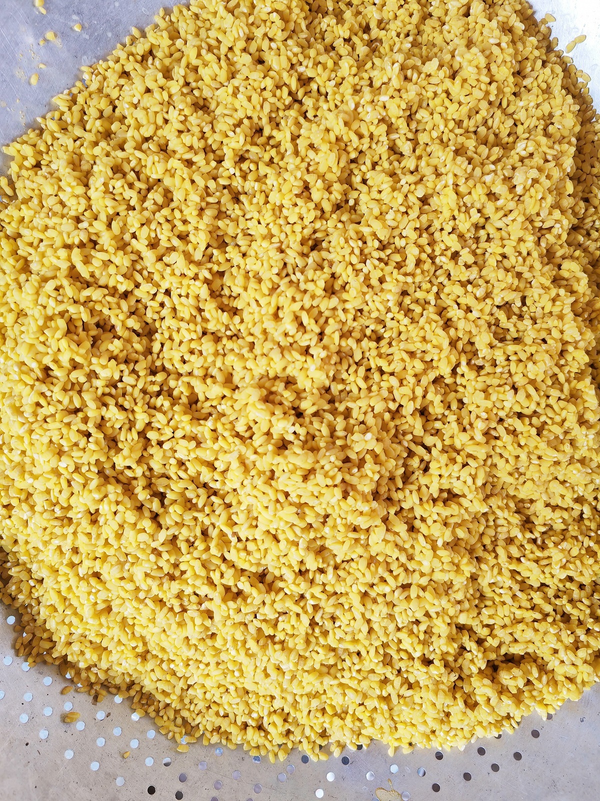 取出用染饭花水泡好的糯米,均匀地铺在蒸笼里的纱布上,把搓好的“圆球”一个一个放在糯米上,再撒一层糯米,盖上锅盖,蒸两个小时,油润光亮、颜色金黄的黄花粑粑就出锅了。