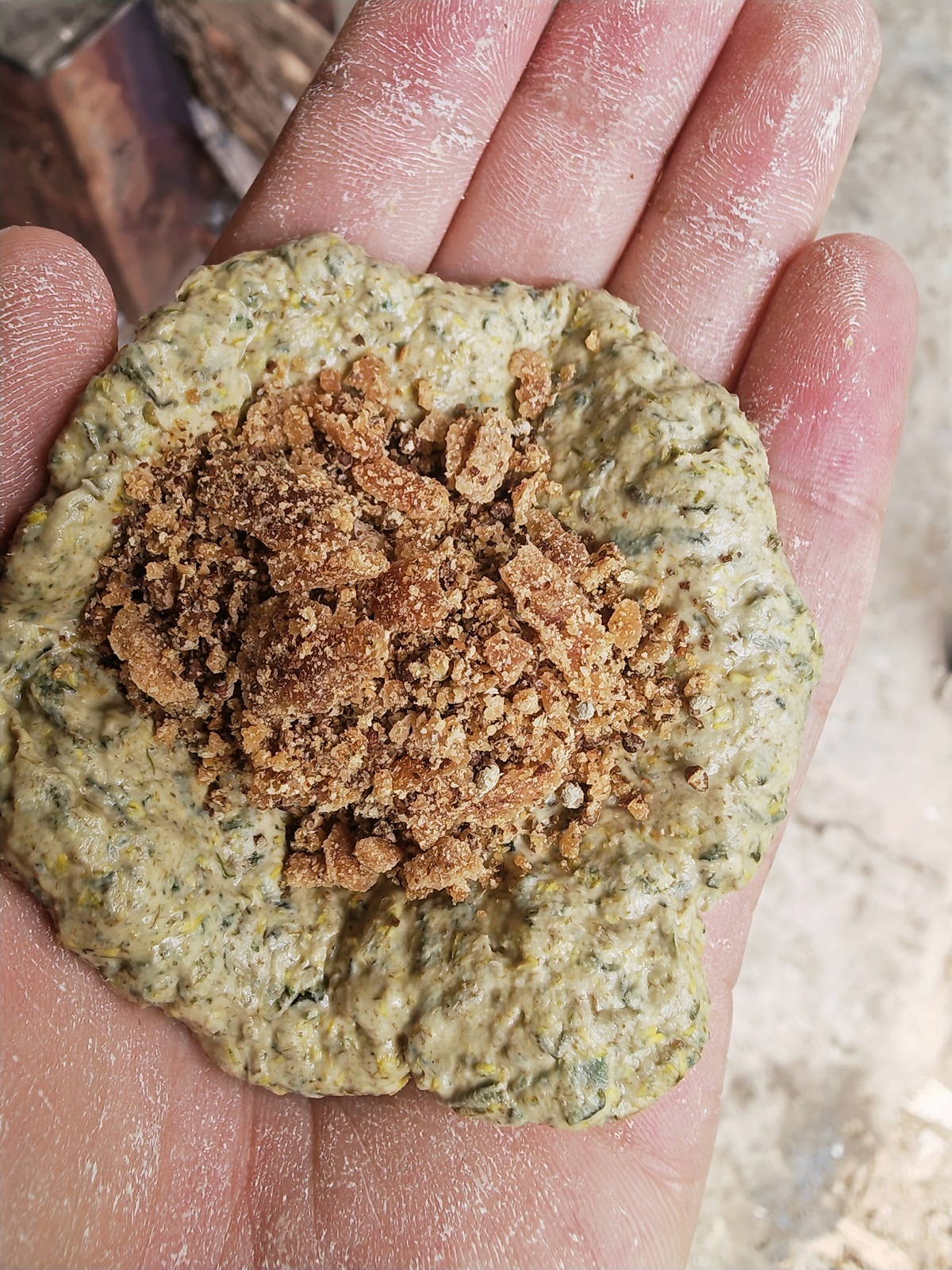 黄花粑粑的制作过程不算复杂,但也需用心对待。去除黄花的枯叶,将其洗净、沥水、切成小段并舂碎,然后将红糖水和糯米面混合搅拌,揉成软硬适中的面团。馅料是这道美食的关键所在,需要把苏子、花生、红糖放在一起捣碎,加入适量猪油,搅拌做成馅料。馅料里的红糖遇热化汁,与苏子搭配出甜而不腻的流心口感,让本就丰富的味道相得益彰。