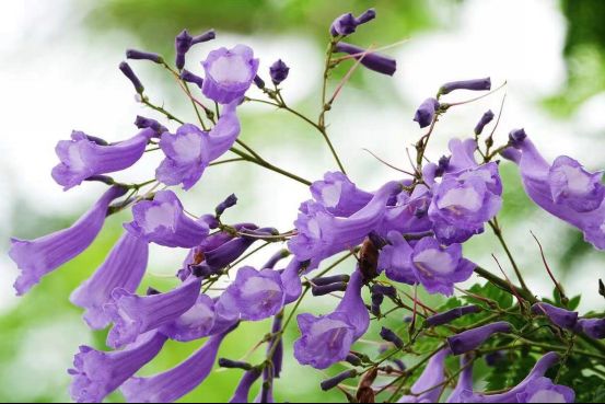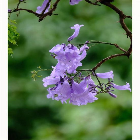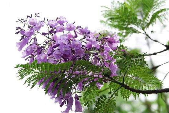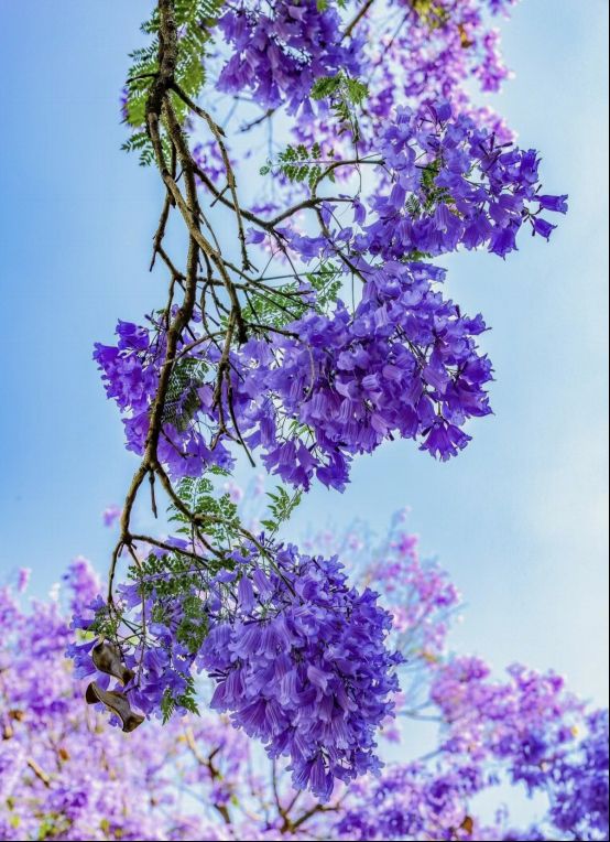 冬去春来,如今的蓝花楹已长成大树,粗黑的树干,撑起一把把巨伞,每到初夏,一串串紫色的花朵铺满街头,散发出淡淡的馨香。