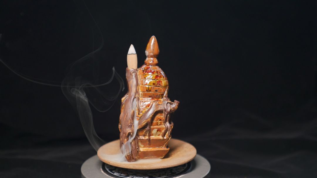 香炉一体成型,塔身缠绕着树木,树与塔相互依偎,仿佛诉说着千年的故事。保玉孟以芒市树包塔为灵感,独具匠心地运用傣陶技艺创作出来,将芒市树包塔这一神奇的自然景观完美地呈现在人们眼前。
