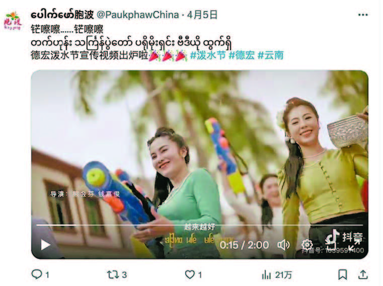 《德宏团结报》报道,随着中华文化国际影响力的不断提高,中国少数民族传统节日也被越来越多的海外友人喜爱。泼水节是中国傣族最隆重、最盛大的传统节日,也是傣族历史、文化、艺术的集中展示,更是国家级非物质文化遗产,还是中国各族人民大团结、大联欢的盛会。4月12日,在2024年德宏州泼水节现场,数万名当地各族群众与远道而来的游客欢聚在一起,互相泼水祝福。现场洋溢着热情奔放的节日气氛,充满了欢歌笑语。活动期间,德宏州融媒体中心利用自身国际传播优势,及时在Facebook、Twitter、YouTube等平台发布泼水节各类信息及短视频,吸引了60多万海外网民阅读观看,全网总计覆盖260万人,受众遍布亚洲、欧洲、美洲、非洲的40多个国家和地区。德宏州融媒体中心原创的缅语短视频《德宏泼水节,胞波小分队出击!》在Facebook上的阅读量突破了10万次;《铓嚓嚓……铓嚓嚓……德宏泼水节宣传视频出炉啦!》在Twitter上阅读量超过25万+;《德宏泼水节现场,太嗨了!》在Facebook上的阅读量突破了10万次。