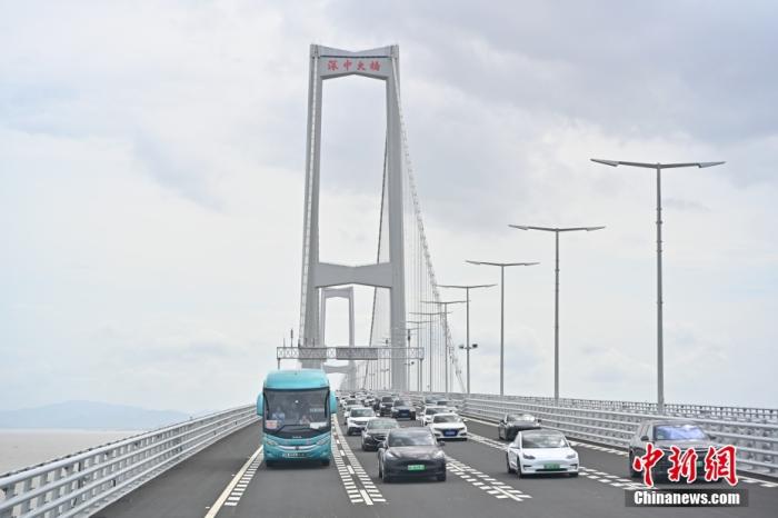 资料图:6月30日15时,历经逾7年的建设,粤港澳大湾区核心工程深中通道通车试运营。图为广东中山,车辆行驶在深中大桥上。中新社记者 陈骥旻 摄