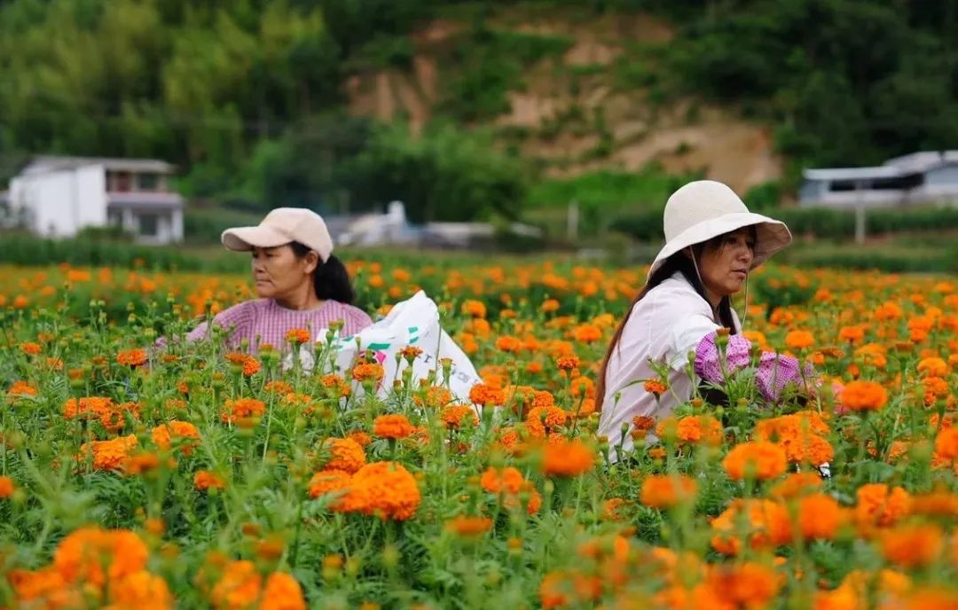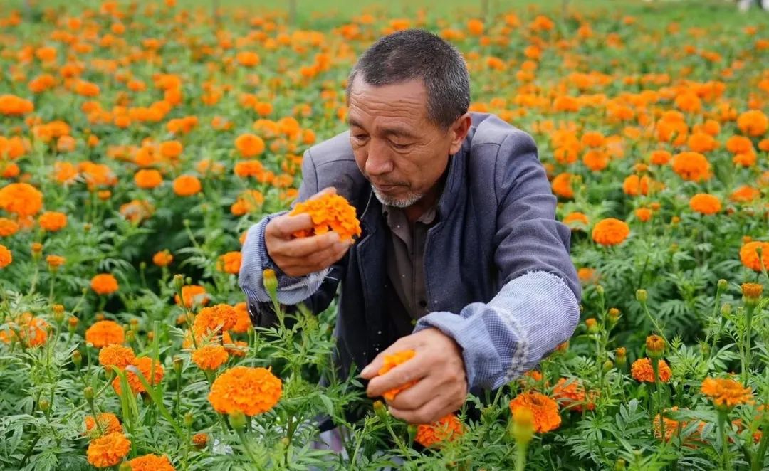 万寿菊是一种草本植物,是提取纯天然叶黄素的最佳原材料,其花和叶均可入药。由于种植万寿菊成活率高、花期长,田间管护简单、劳动强度小,每年可以采摘7—10茬,既可以观赏、又可以卖钱,让种植万寿菊的花农尝到了“甜头”,增强了发展产业的信心。