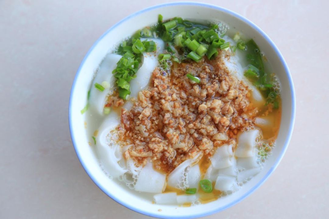 2、做法:将米洗净、碾磨成粉备用。把猪或牛骨放入大锅中加水,用大火煮沸,改小火慢炖,经2至3小时熬成高汤。将米粉用水和成糊,上笼蒸熟,成为稍微有些厚度的片状,在竹干上挂晾,冷后划成条便是米干,即可新鲜食用。将划成条状的米干在沸水中烫散,捞出后把熬好的高汤加入米干,配上肉片或者肉末、辣椒油、薄荷、香菜、豆芽、生菜等佐料调味即可。