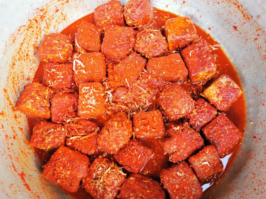 2、做法:选料:黄豆去杂洗净浸泡10小时。磨浆:泡豆,滤渣成豆浆。煮浆:传统锅灶煮浆。点浆:用百年传统酸浆水点制的豆腐口感香润。成形:舀豆腐花上模具,2—3个小时后滤干水就是豆腐。制作毛豆腐:把豆腐切块,晾晒2—3小时后,用布盖住5天自然发酵即成毛豆腐。酱料调制:食盐、胡椒粉、八角粉、草果粉、香菜籽粉、茴香籽、辣椒粉、干姜丝和鲁史土产白酒等适量调成酱料。制酱豆腐:拌匀配料与毛豆腐,装罐密封腌制一年至皮层红润、心酥黄即成。