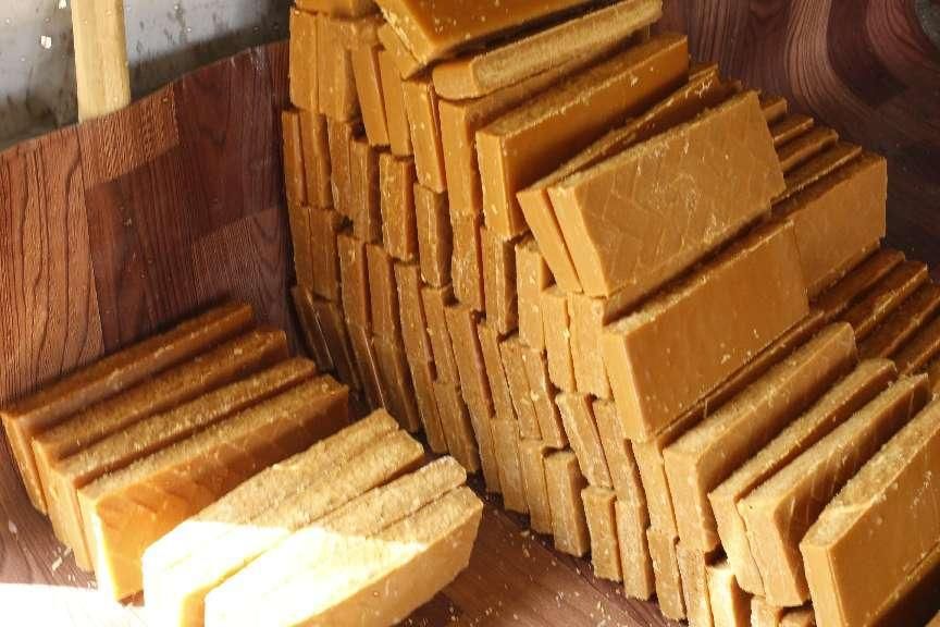 2、做法:将采回来的新鲜甘蔗去除根须及叶片后放入榨汁机进行榨汁。把榨取出来的甘蔗汁用木瓢和竹编漏勺进行甘蔗汁的除杂质。在熬煮前再用纱布进行过滤。在直风灶的连环锅里倒入糖汁后,用大火进行热煮,蔗液逐渐变得稀稠,再改用小火慢慢熬煮,直至原液70%的水分已被蒸发、凝聚下来近30%的黏稠蔗液。待水分散去,糖浆剩至三分之一时用长木棒不停地搅拌,让糖浆尽快凝结。待糖浆呈拉丝状态,下灶,倒入木盆进行冷却,待20分钟左右,再用短的木棒进行搅拌。待成沙后,倒入模子后冷却约1个小时,再切片。